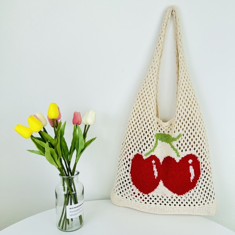 Stylish Cherry Design Hollow Handbag Women Knitted Crochet Large Tote Bag Lightweight SHoulder Bags for Summer Beach or Outing